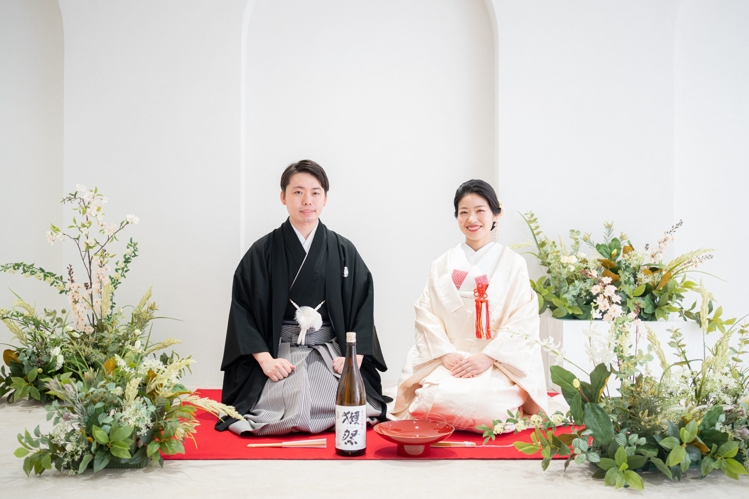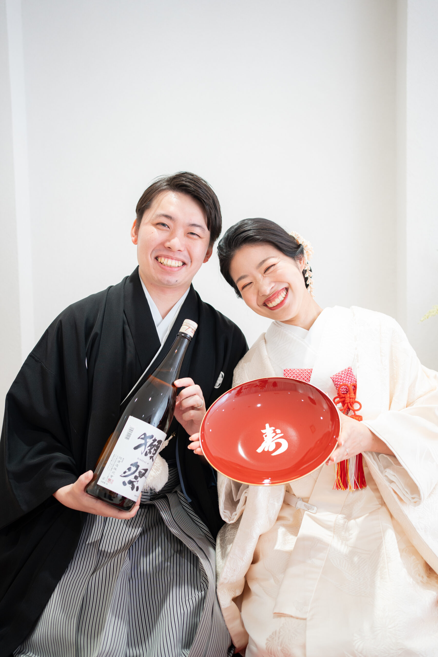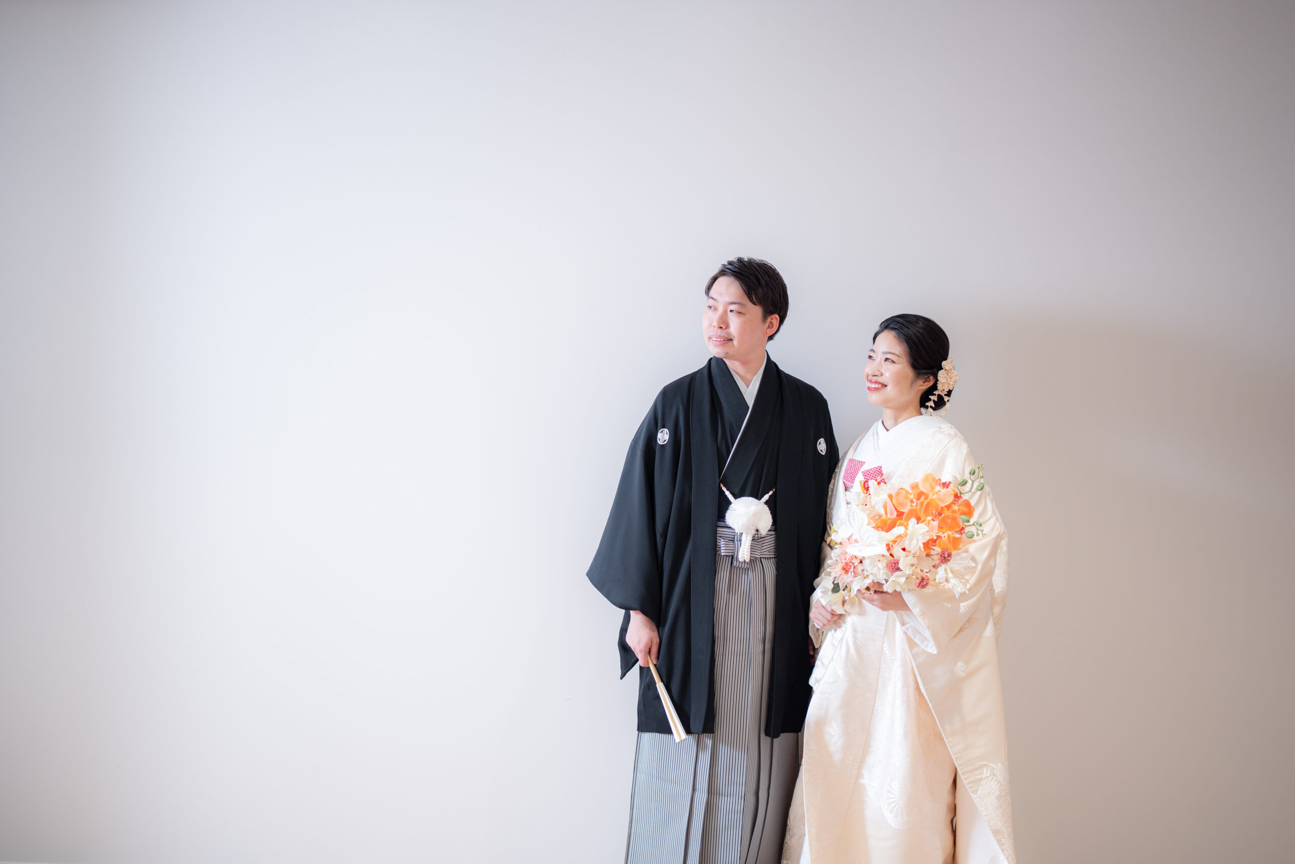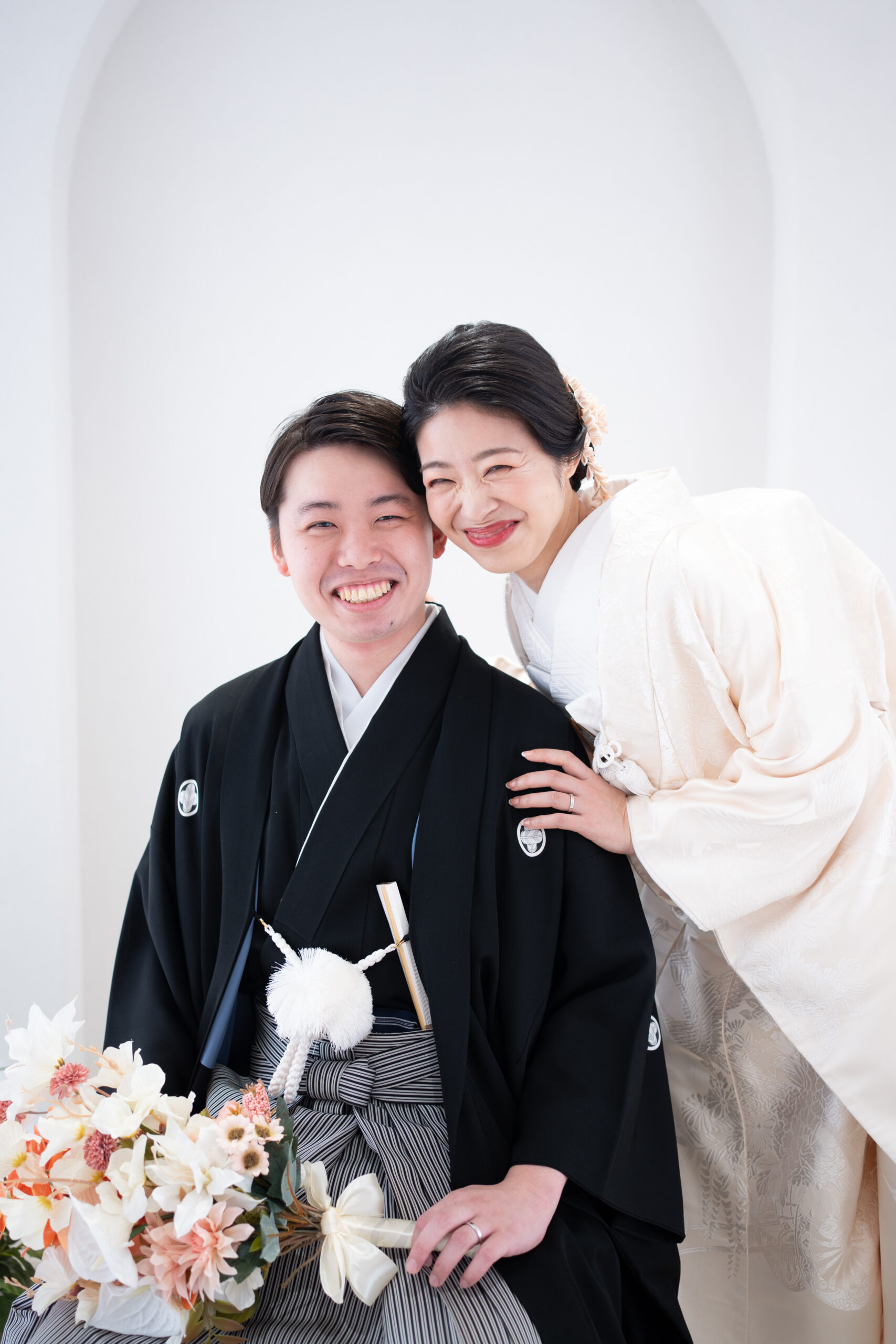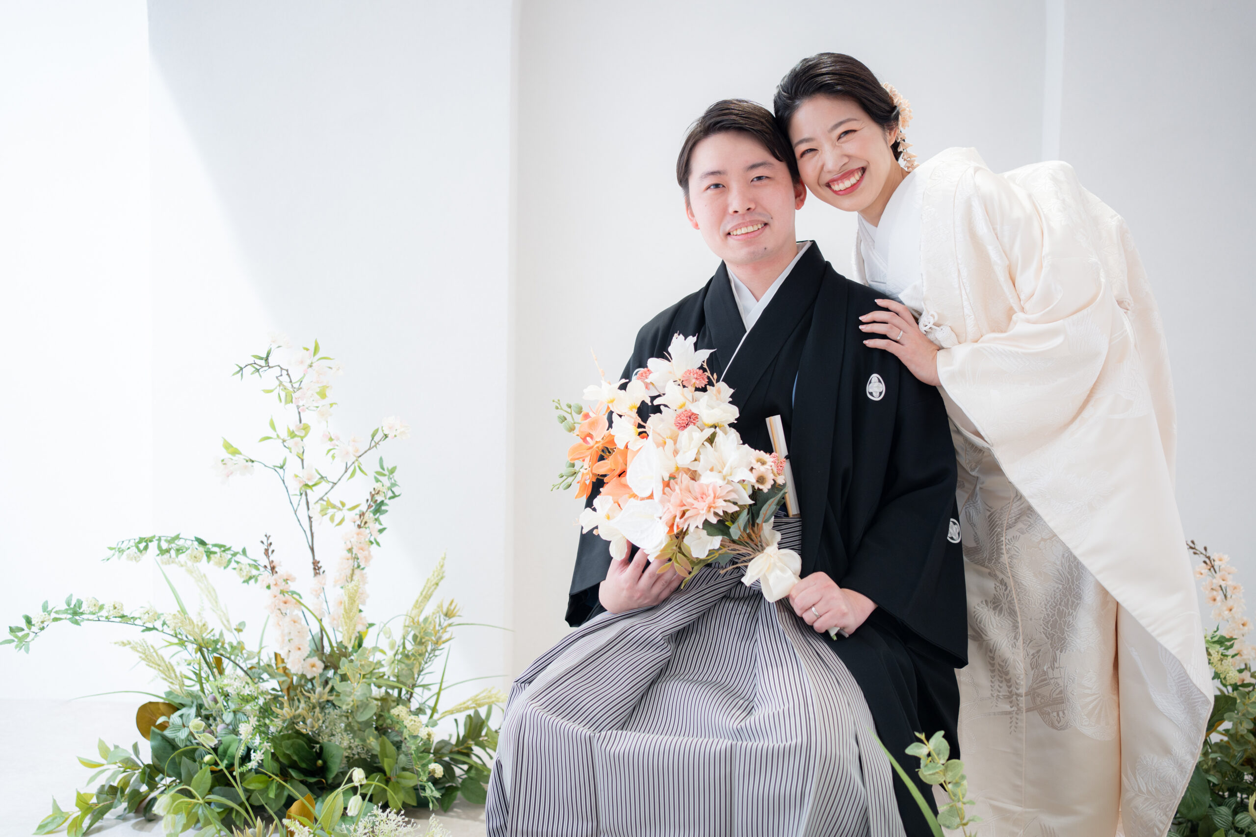 (((WASOU PLAN)))結婚式の前撮りとして和装でのウェディングフォトを撮影いただきました。白無垢と紋付袴での撮影は、白いスタジオに映える凛々しさ。お持ちいただいた和装ブーケはご新婦様のご自前で、白無垢に優しく映える素敵なブーケでした。キリリとした和装ならではのフォトだけではなく、お2人をつなぐきっかけにもなった【日本酒】を撮影アイテムとして採用。「見返したときに笑顔になれるようなフォト」をご希望だったお2人らしい、素敵な笑顔のフォトになりました。前撮りのフォトデータは結婚式のペーパーアイテムやWEB招待状にもおすすめです。スケジュールなどお気軽にご相談くださいませ。