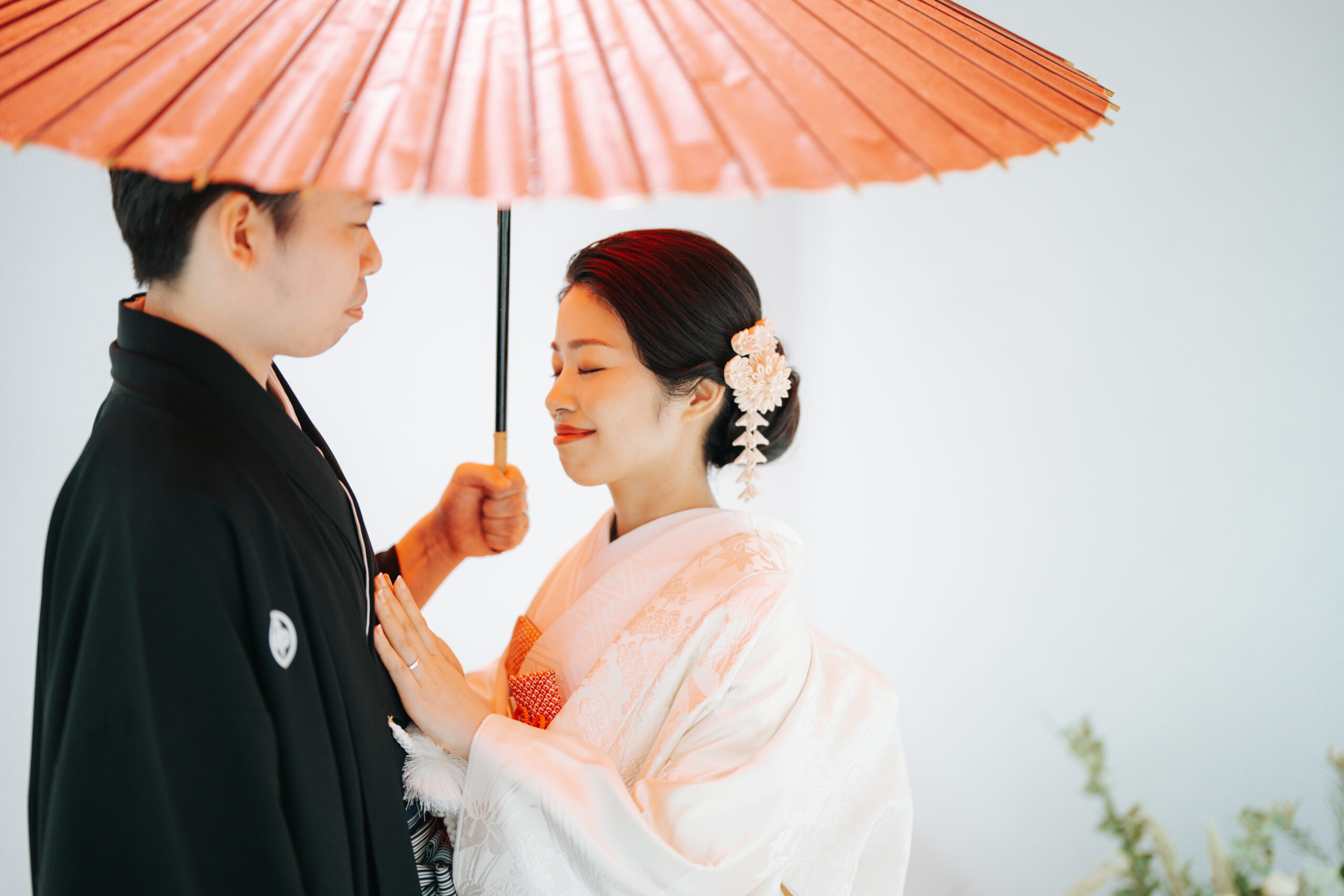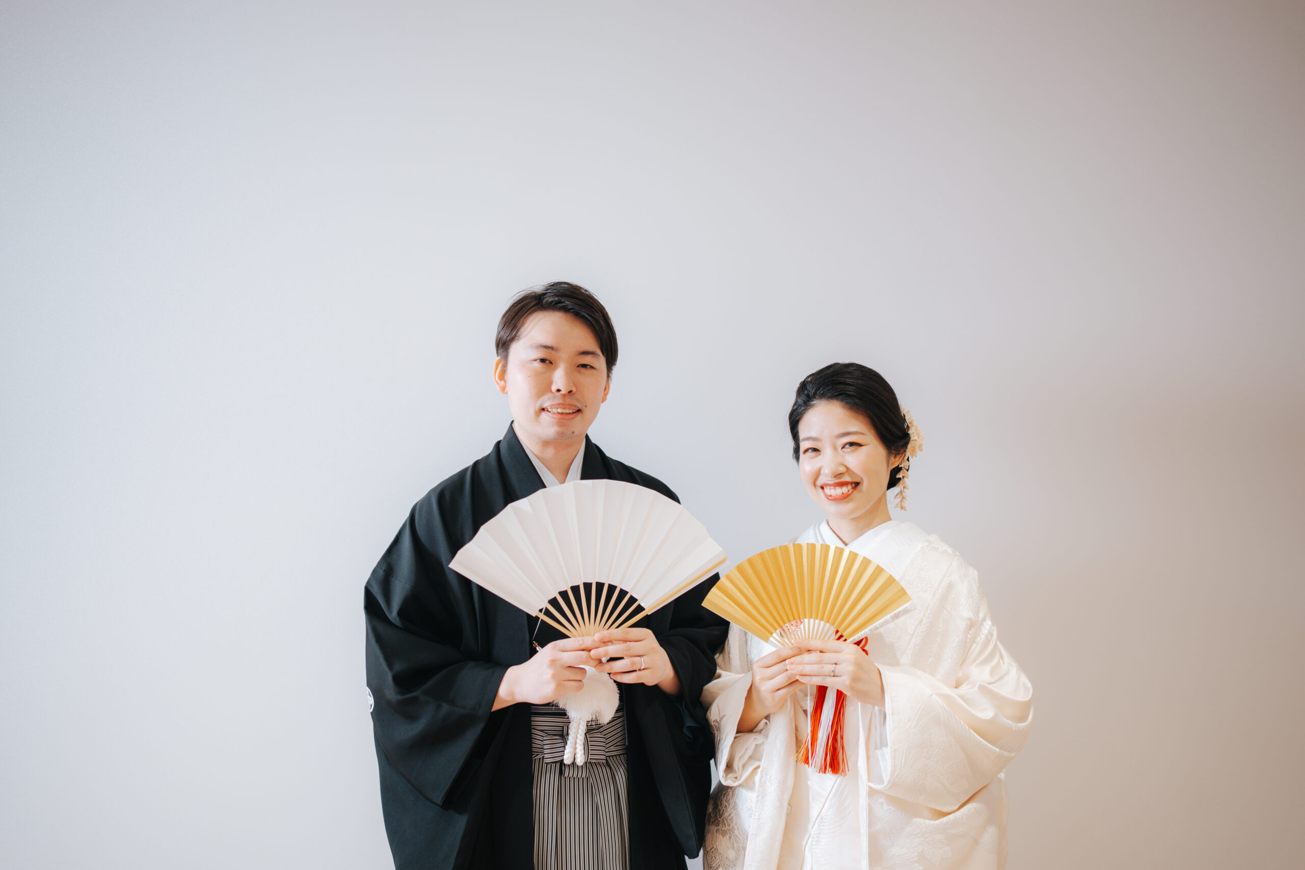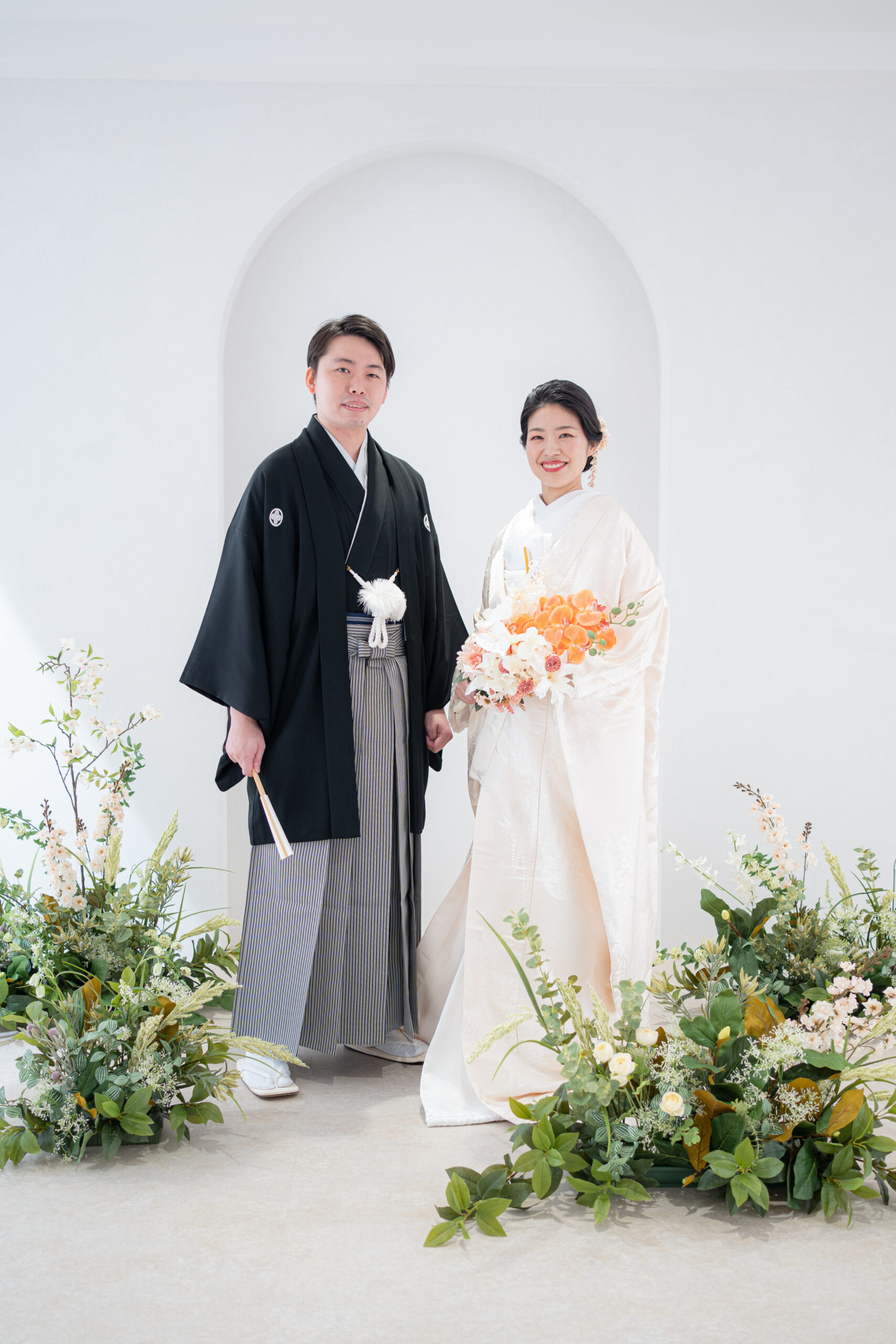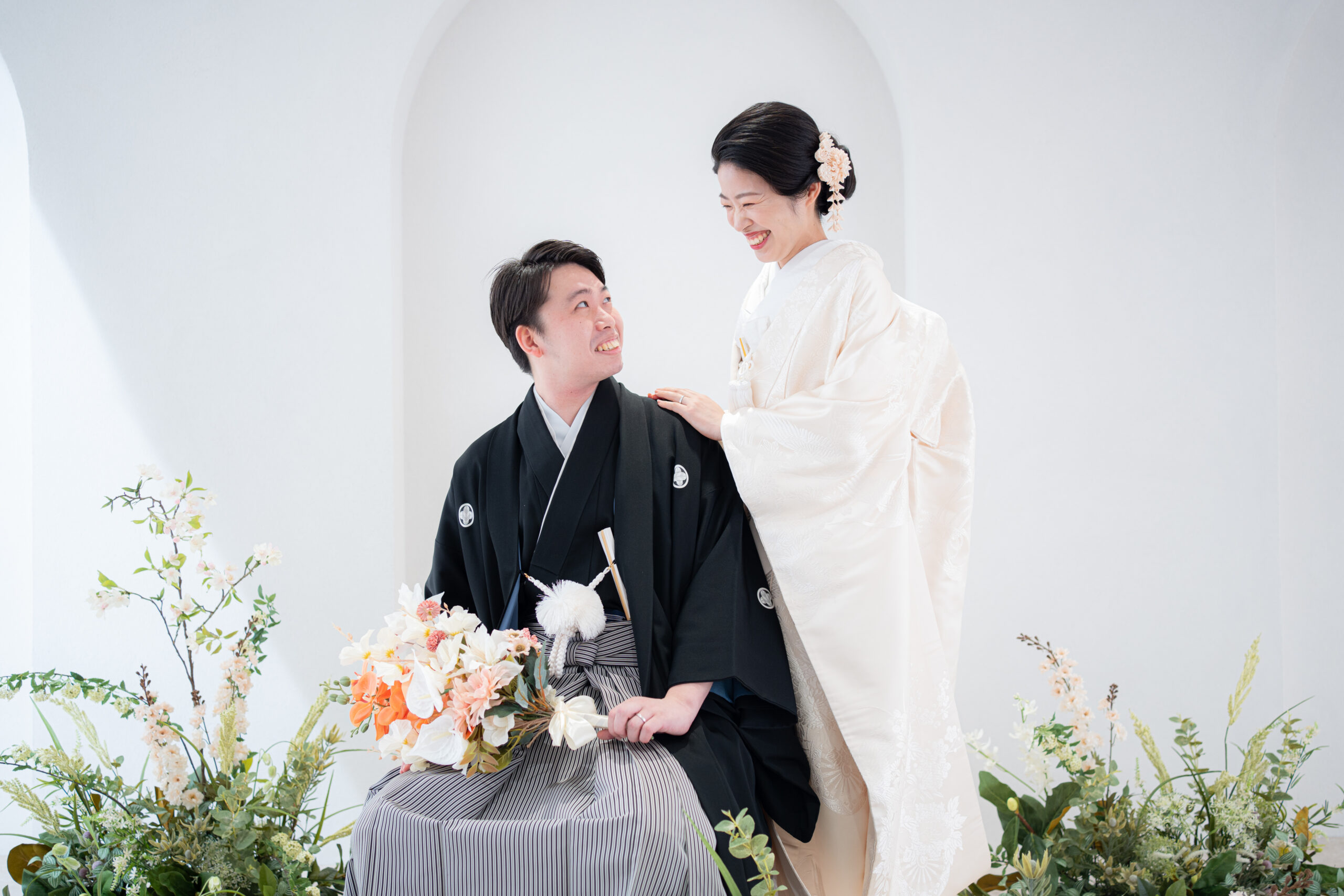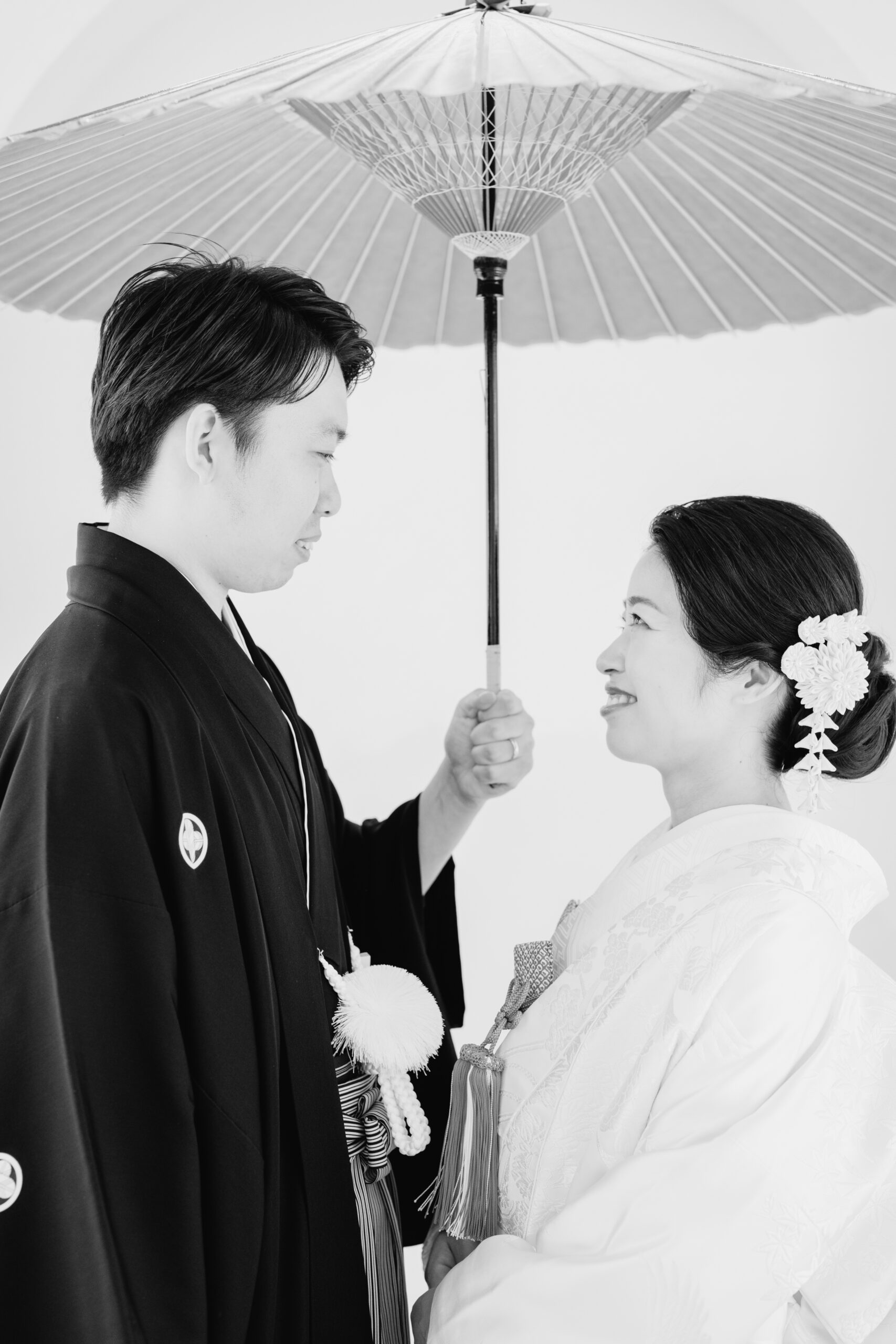 (((WASOU PLAN)))結婚式の前撮りとして和装でのウェディングフォトを撮影いただきました。白無垢と紋付袴での撮影は、白いスタジオに映える凛々しさ。お持ちいただいた和装ブーケはご新婦様のご自前で、白無垢に優しく映える素敵なブーケでした。キリリとした和装ならではのフォトだけではなく、お2人をつなぐきっかけにもなった【日本酒】を撮影アイテムとして採用。「見返したときに笑顔になれるようなフォト」をご希望だったお2人らしい、素敵な笑顔のフォトになりました。前撮りのフォトデータは結婚式のペーパーアイテムやWEB招待状にもおすすめです。スケジュールなどお気軽にご相談くださいませ。