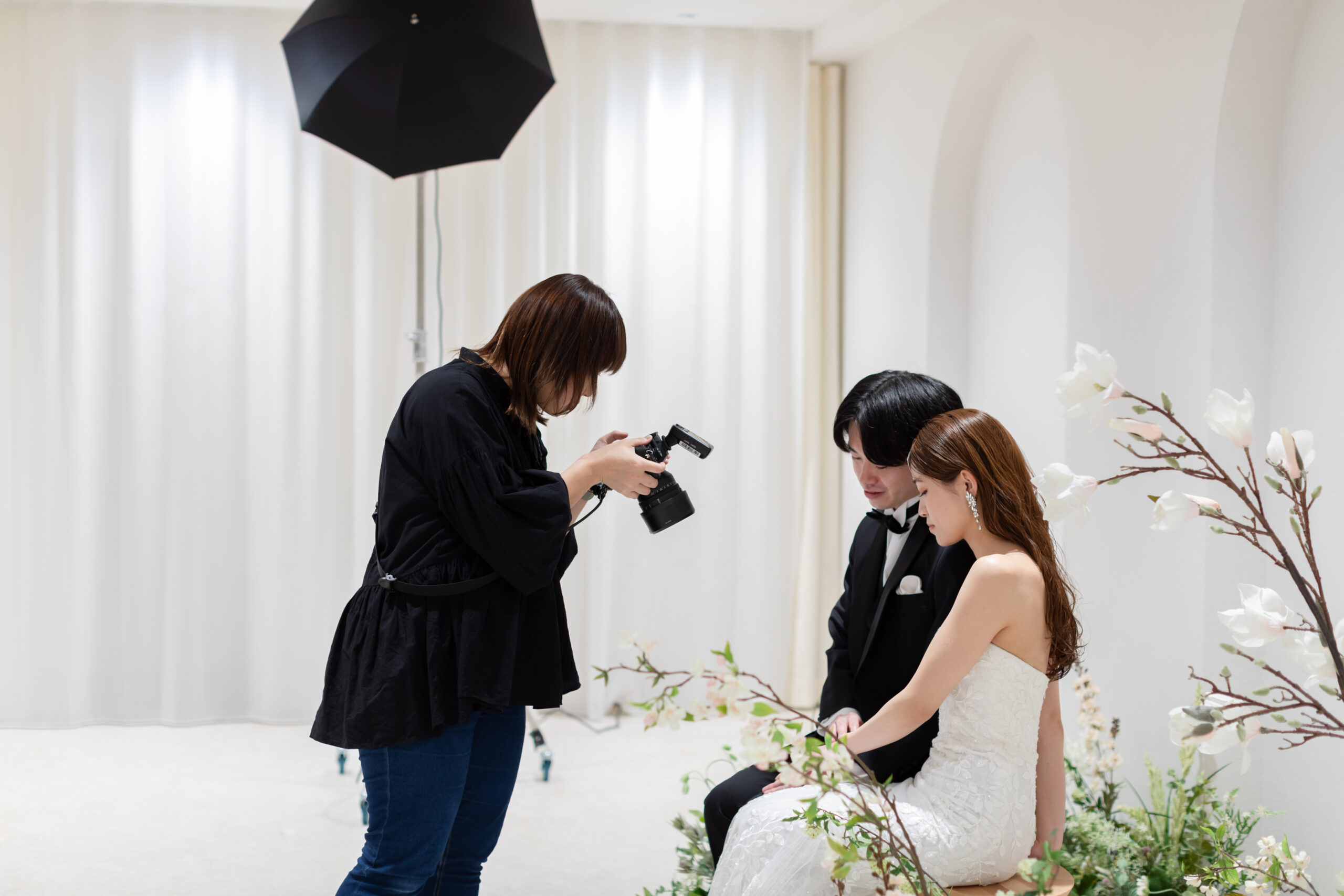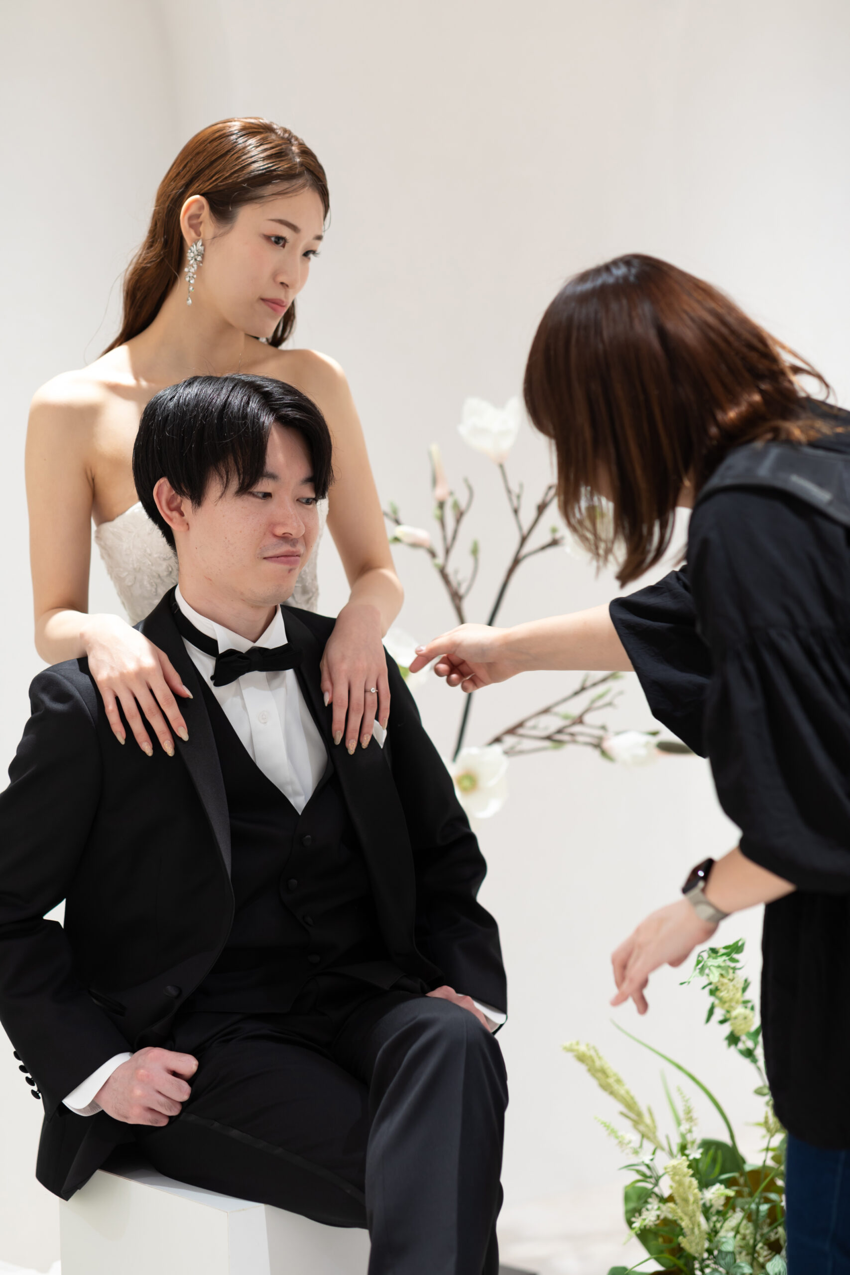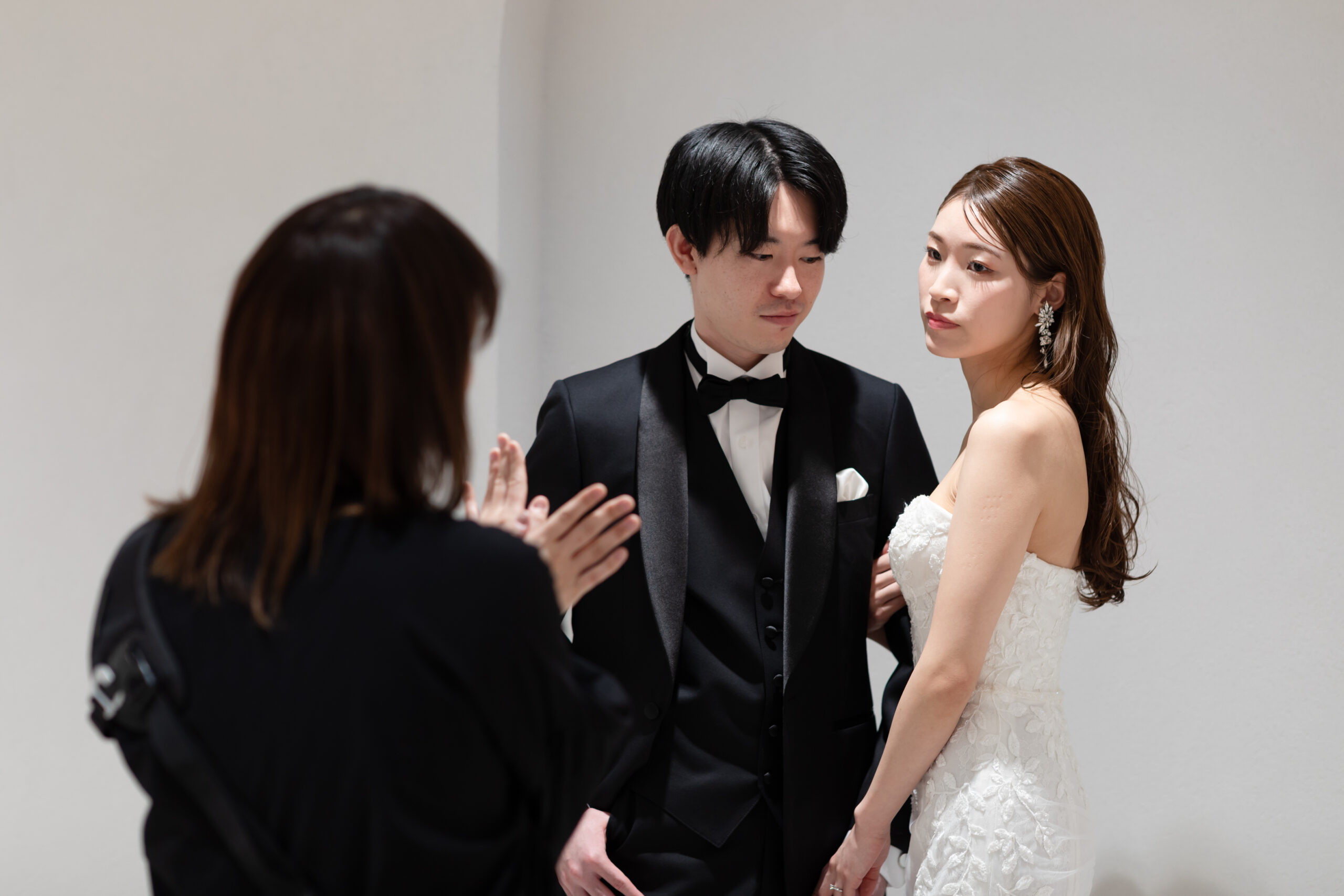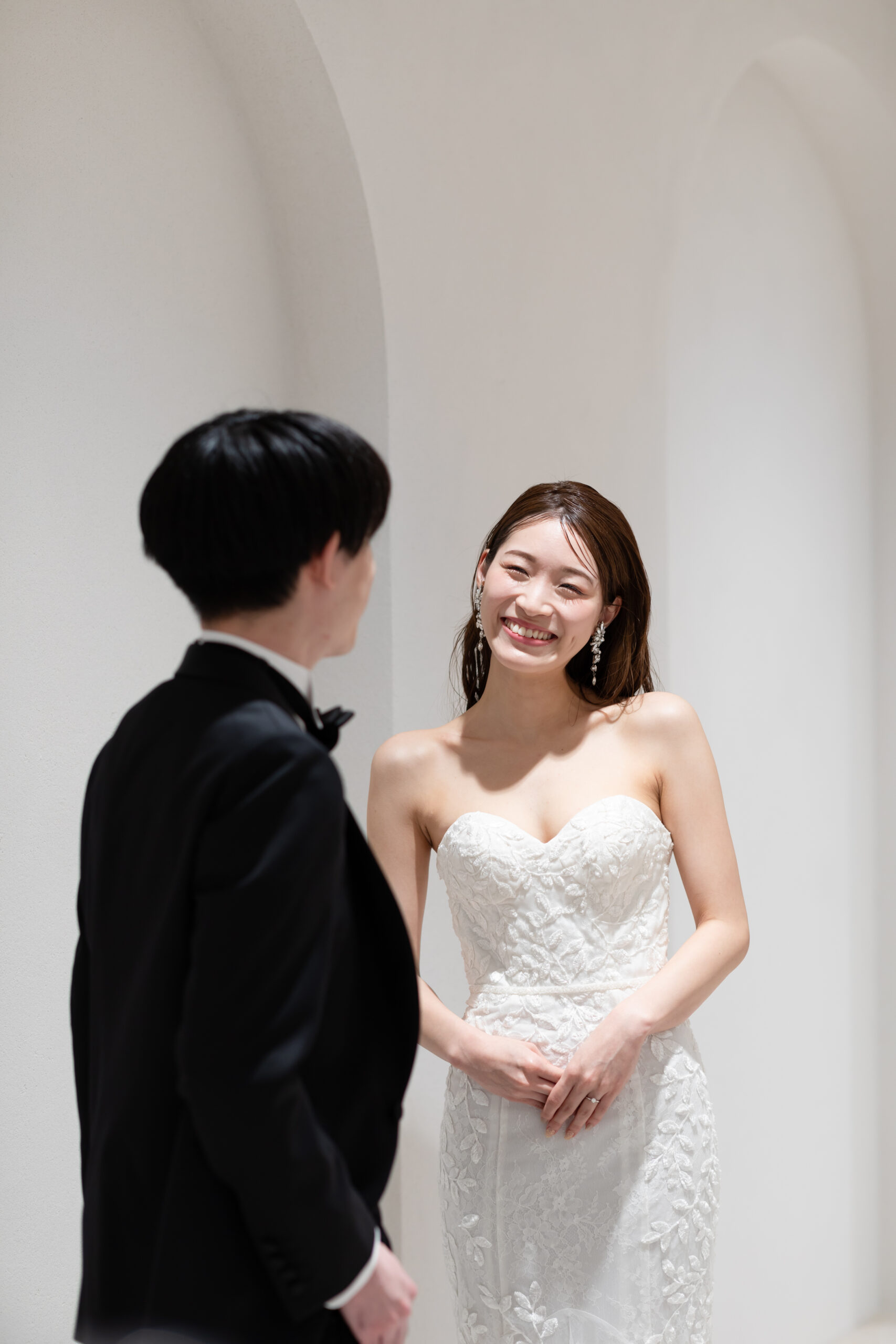 ((( 撮影オフショット)))初めてのウェディングフォト撮影はポージングや表情など不安なもの。決まったポージングやカットがないからこそ、フォトグラファーがお2人とのコミュニケーションの中で自然な表情を引き出していきます。撮影が進むにつれてどんどん素敵な表情に。それを見守るお互いの笑顔もまた素敵な思い出です。