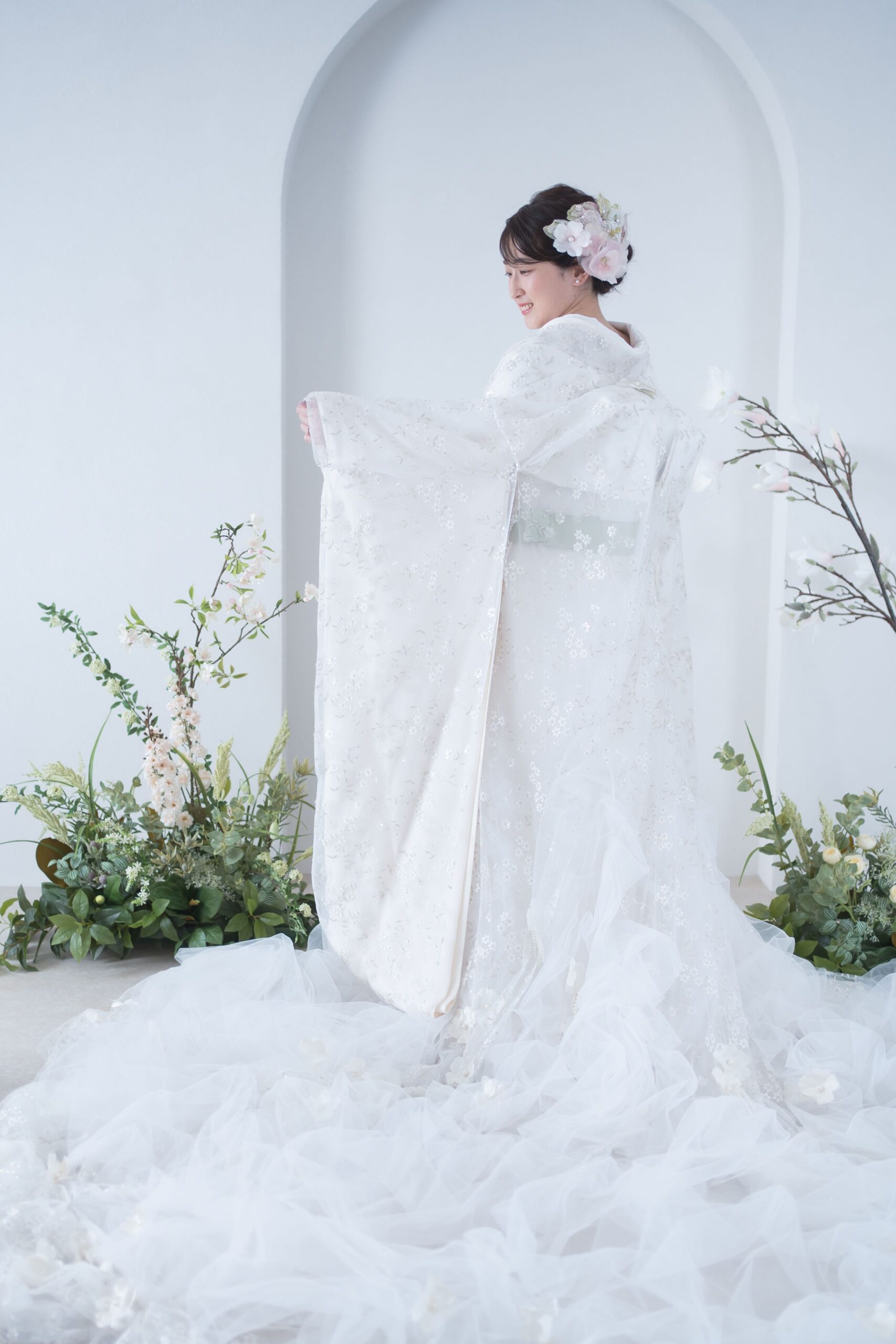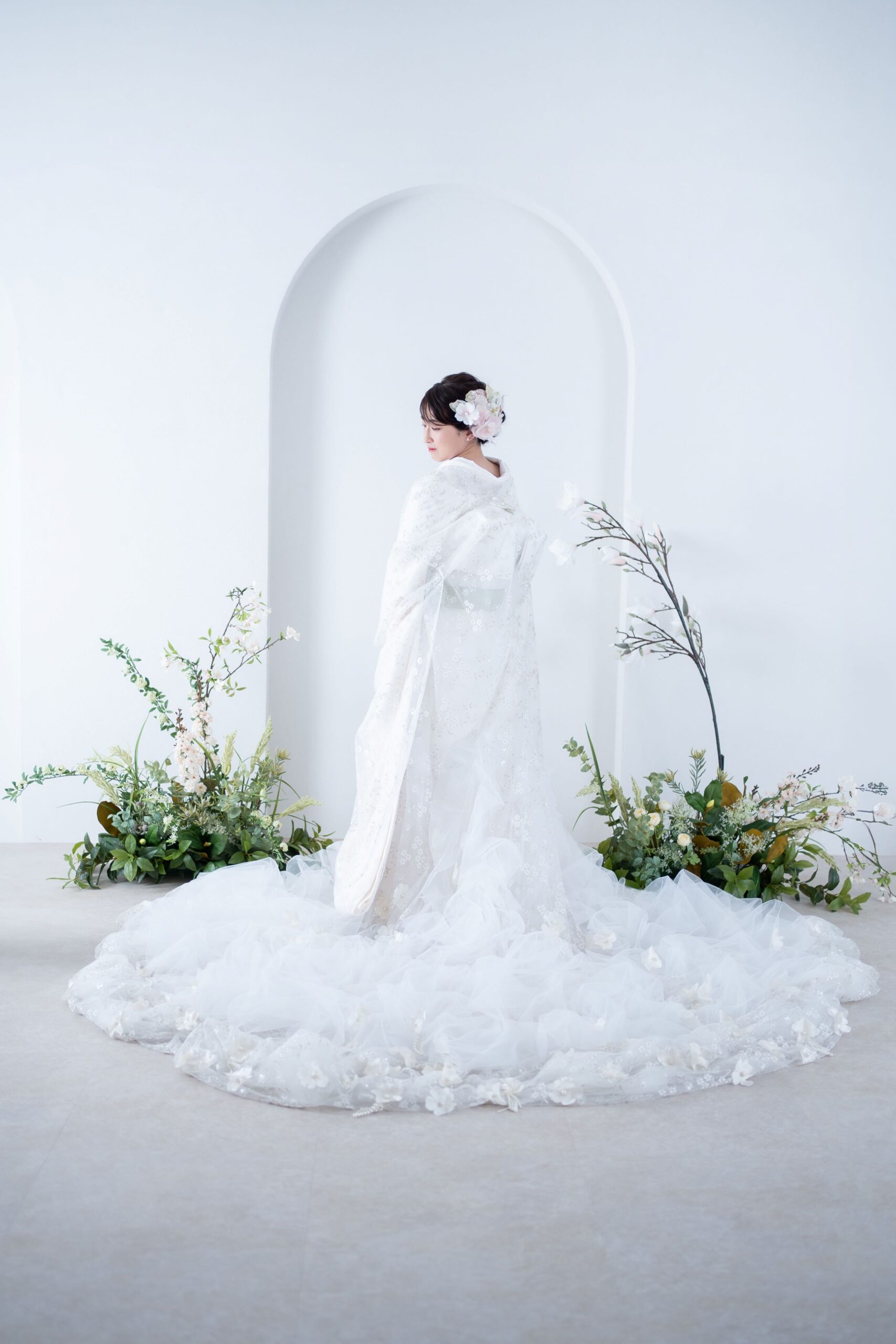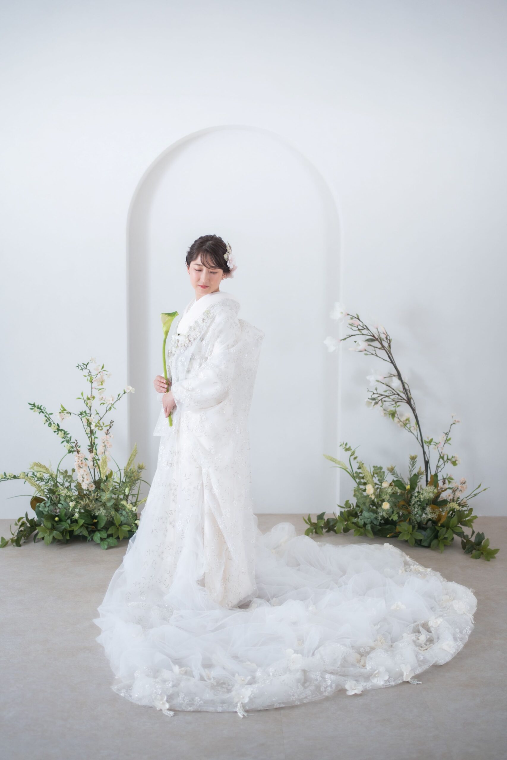 繊細かつ贅沢な打掛の魅力は、シンプルなスタジオだからこそ余すことなく