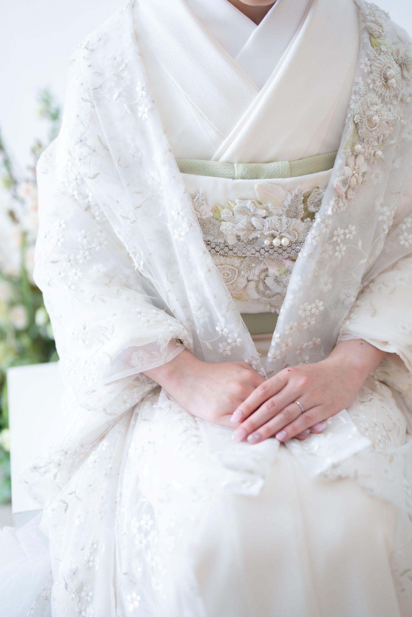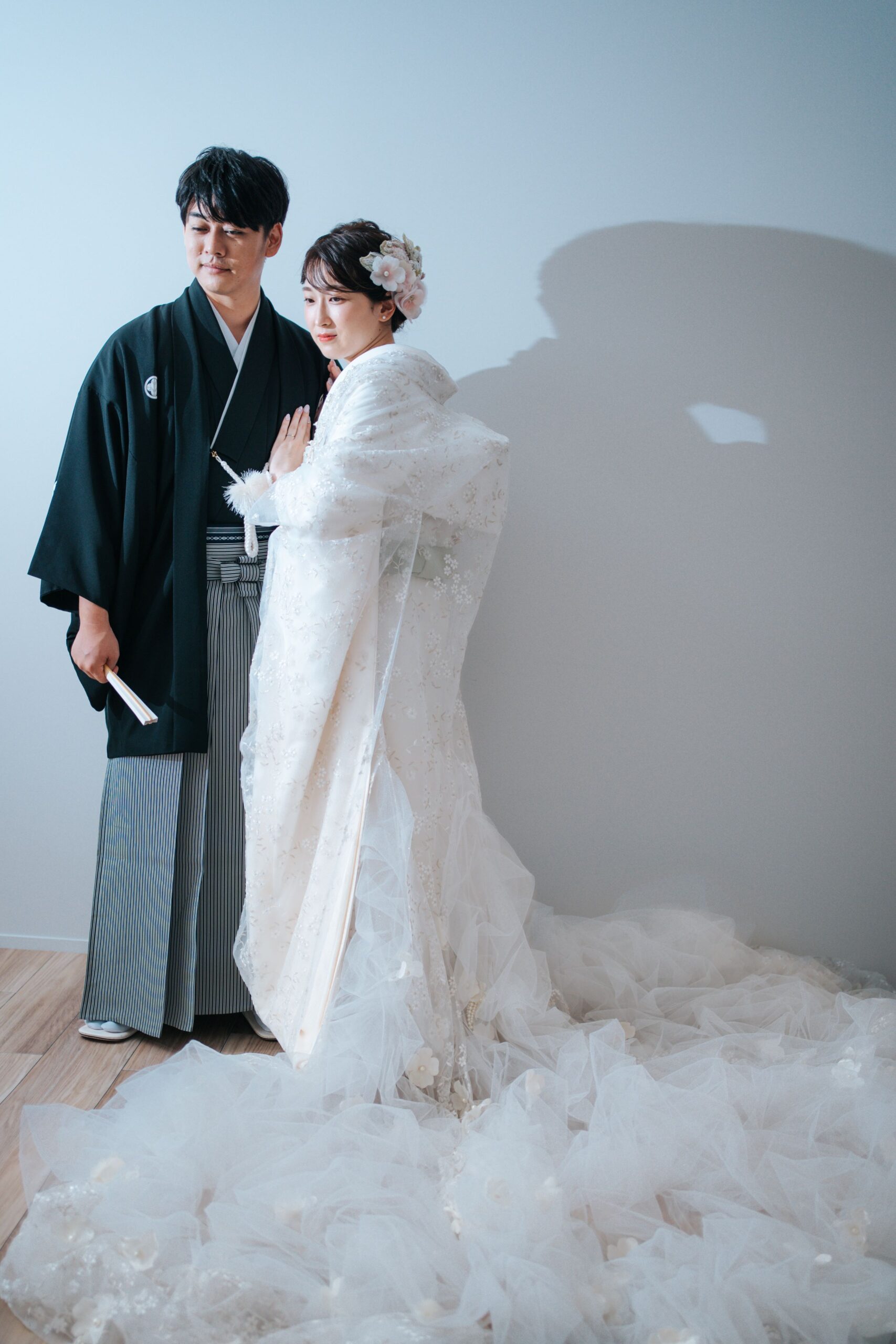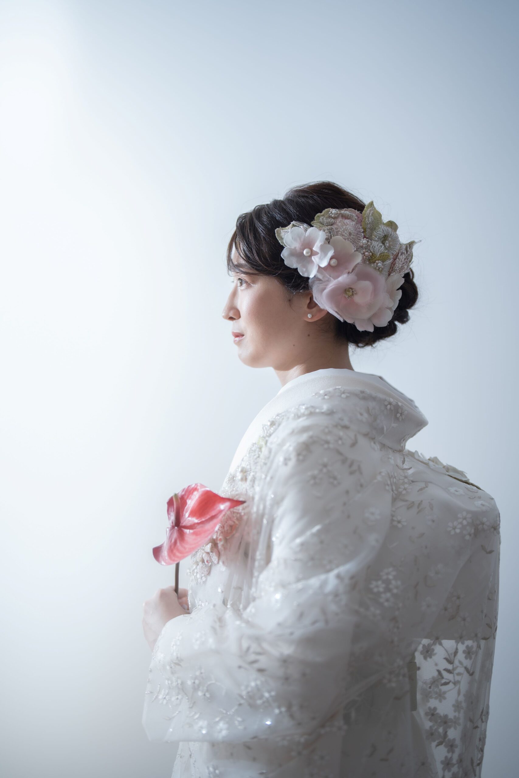 繊細かつ贅沢な打掛の魅力は、シンプルなスタジオだからこそ余すことなく