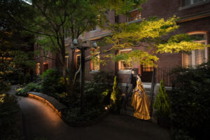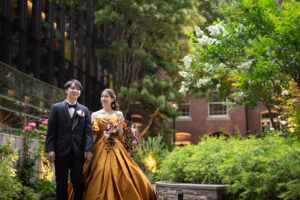 まずは三菱一号館美術館。近代的なビルが建ち並ぶ丸の内の中で、ひときわ目を引くクラシカルな空間です。バラの季節のガーデンは緑に溢れ、上品なマスタードカラーのドレスがレンガ色の建物にもガーデンにもぴったり。段々と暮れていく夕暮れの時間も、より一層シックな雰囲気です。