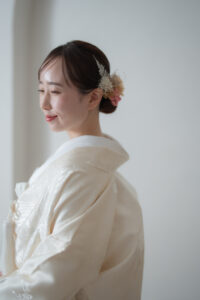 余計な色やモチーフがないからこそ、白無垢の繊細な文様や、花嫁様の佇まい、感情の機微が、写真の中心で主役として際立ちます。